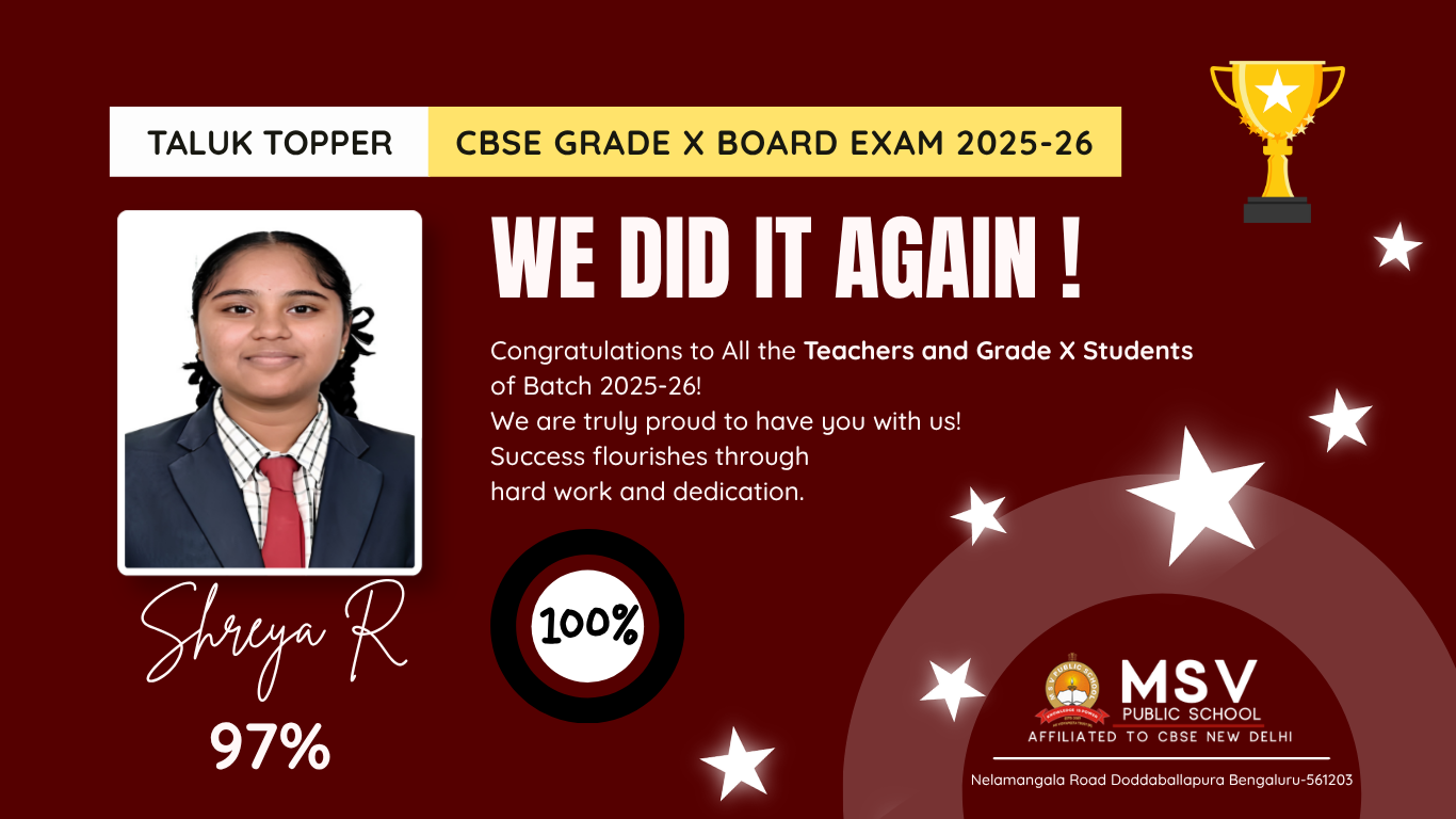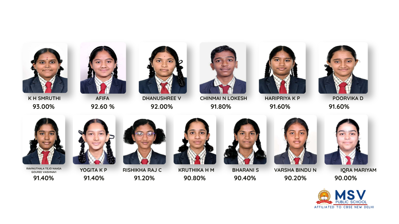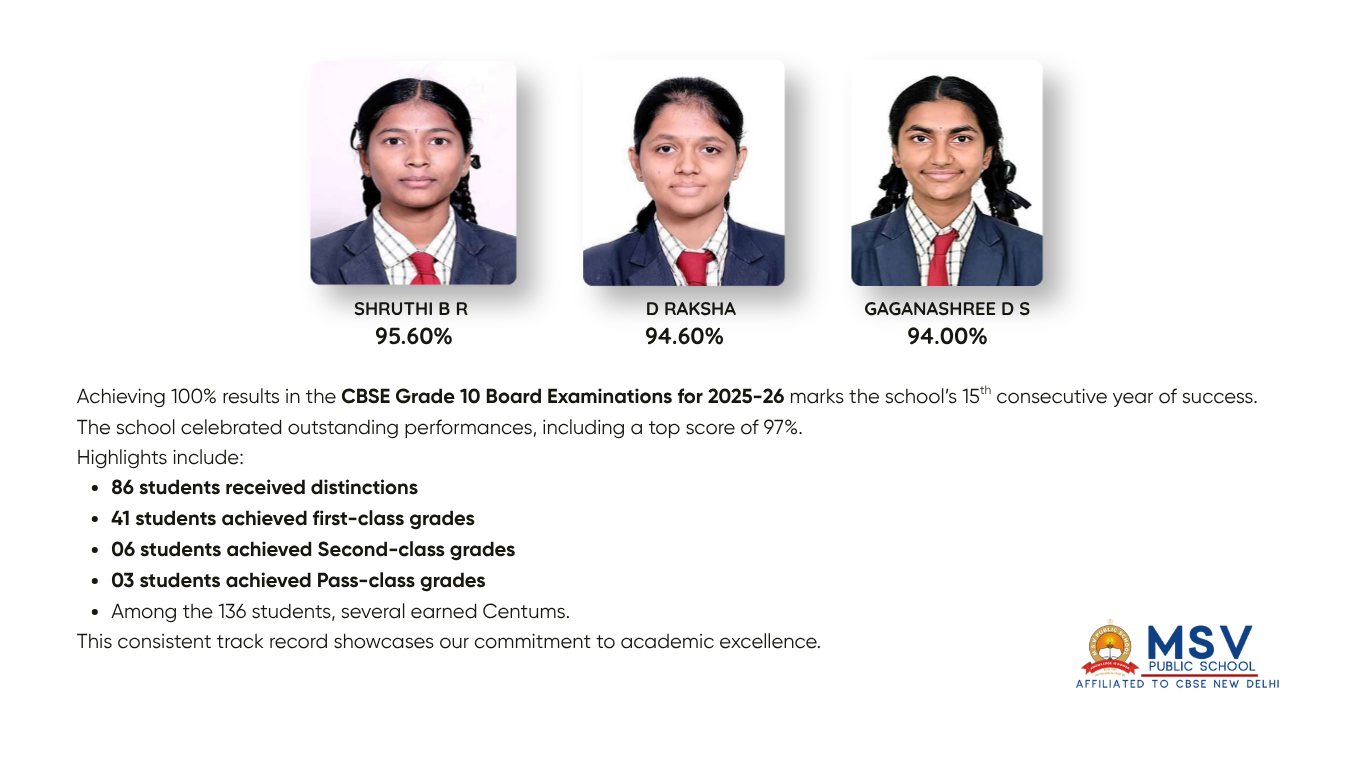 academic year 2024-25. MSV is proud to have maintained consistent quality education over the years. Since 2011, MSV Public School has produced thirteen batches of students for the CBSE Board Exams, with a 100% pass rate each year.